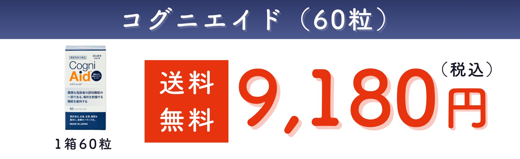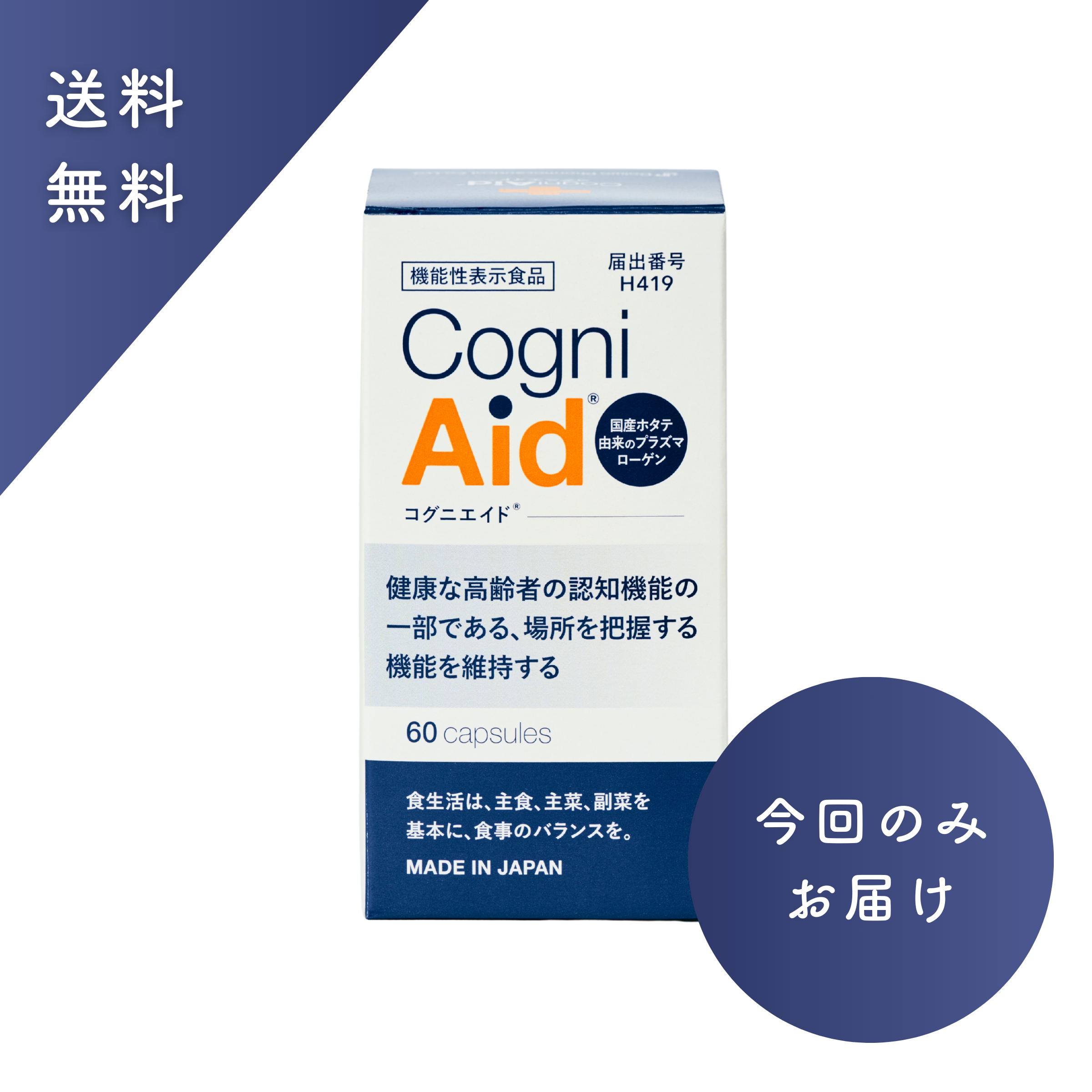 コグニエイド(60粒) 販売価格:9,180円(税込)送料無料 コグニエイドは、ホタテ由来のプラズマローゲンを含むサプリメントです。ホタテ由来プラズマローゲンには、健康な高齢者の認知機能の一部である、場所を把握する機能を維持することが報告されています。(機能性表示食品 届出番号 H419) 1日2粒を目安に、そのまま水でお召し上がりください。