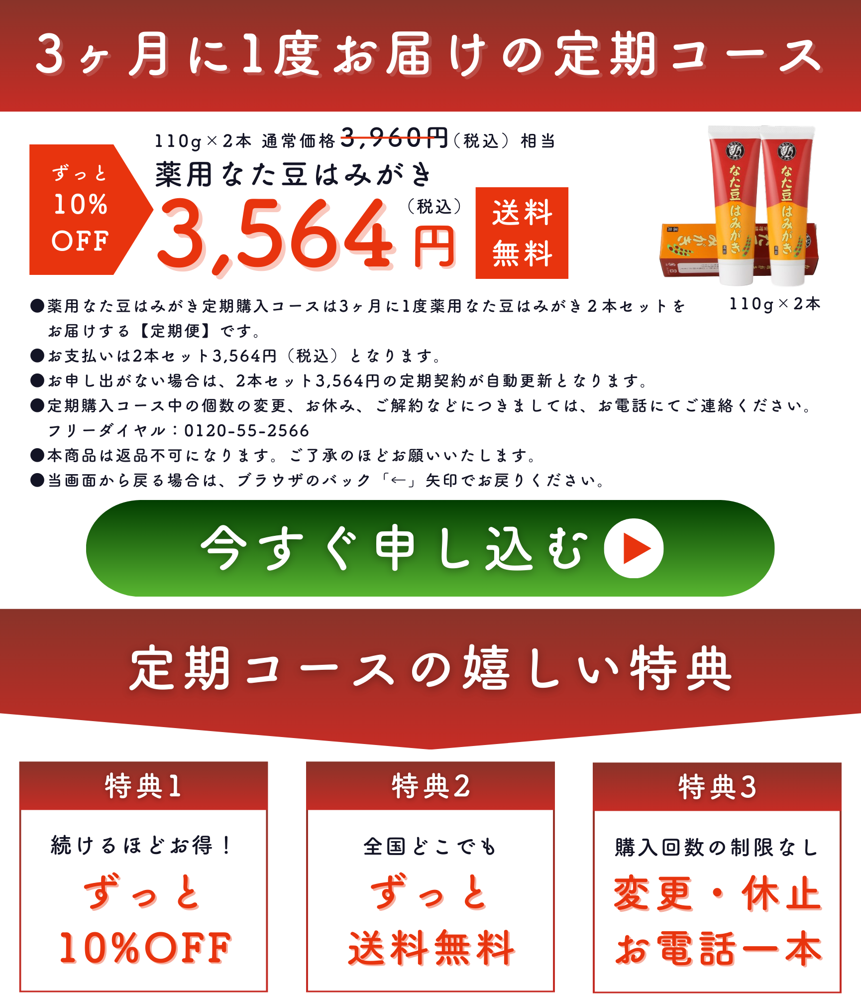 【定期購入】薬用なた豆はみがき(110g×2本) 販売価格:3,564円(税込)送料無料 ※定期購入は2本セット、3カ月に1度のお届け 「薬用なた豆はみがき」は、薩摩なた豆を100%使用しています。しかも薬用だからこそ実感できる確かな使用感。歯周病(歯槽膿漏)や口臭・お口のネバネバが気になる方は是非お試しください。