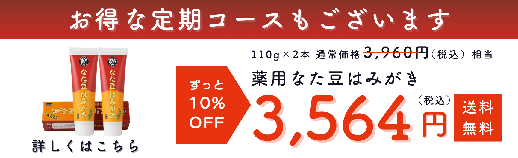 【通常購入】薬用なた豆はみがき(1本110g) 販売価格:1,980円(税込) ※まとめて4本~送料無料でお届け 「薬用なた豆はみがき」は、薩摩なた豆を100%使用しています。しかも薬用だからこそ実感できる確かな使用感。歯周病(歯槽膿漏)や口臭・お口のネバネバが気になる方は是非お試しください。