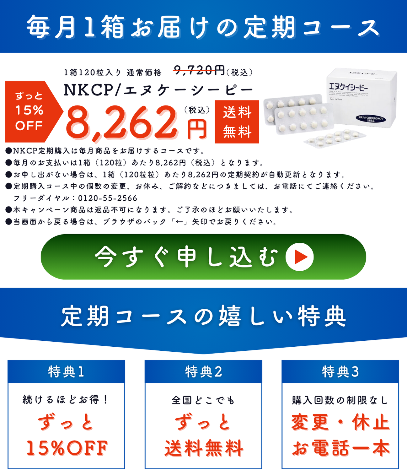 【定期購入】エヌケーシーピー/NKCP(1箱×120錠入り) 販売価格:8,262円(税込)送料無料 エヌケイシーピーの主成分である『精製ナットウ菌培養物(NKCP)』。 大豆を発酵させ、納豆をつくるナットウ菌から特許技術により、有用成分(ナットウ菌産生たんぱく質)を集め濃縮しました。