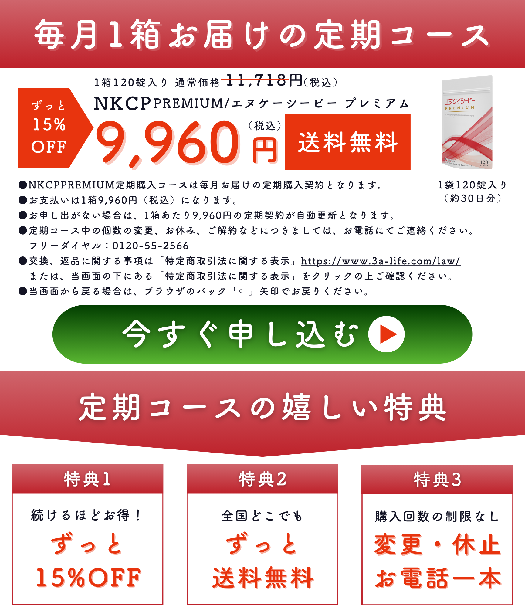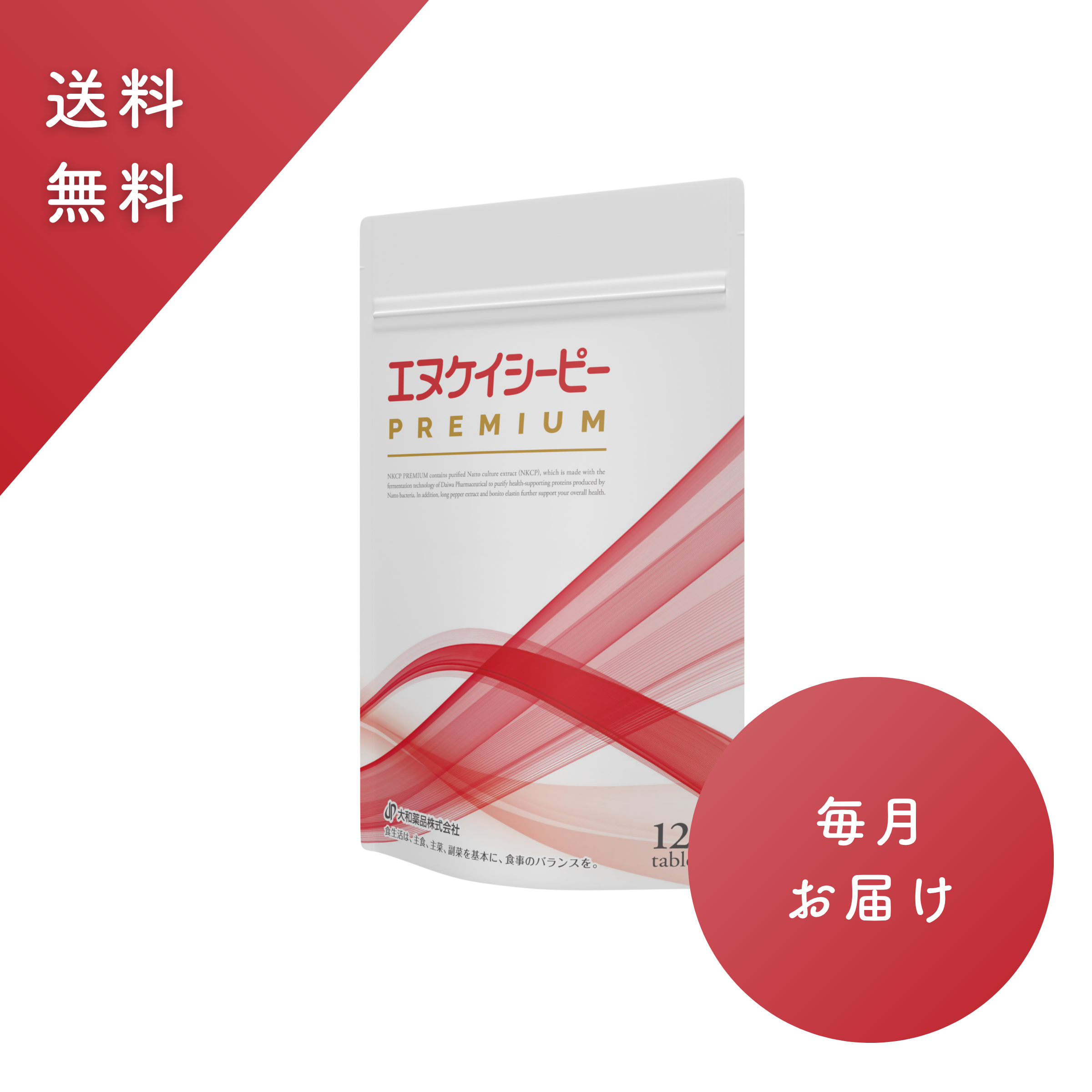 【定期購入】エヌケーシーピー PREMIUM(1袋120錠入り) 販売価格:9,960円(税込)送料無料 すみずみまでめぐりサポート。 エヌケイシーピーPREMIUMはナットウ酵素のエヌケイシーピーにヒハツとカツオエラスチンを配合した健康食品です。 エヌケイシーピーの研究開発には多くの研究機関にご協力をいただいております。 学術論文21報と学会発表22回以上で実証済み。