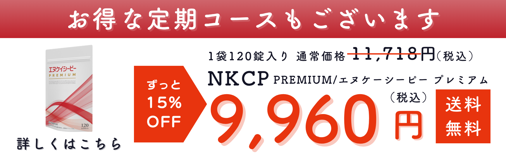 【通常購入】エヌケーシーピー PREMIUM(1袋120錠入り) 販売価格:11,718円(税込) すみずみまでめぐりサポート。 エヌケイシーピーPREMIUMはナットウ酵素のエヌケイシーピーにヒハツとカツオエラスチンを配合した健康食品です。 エヌケイシーピーの研究開発には多くの研究機関にご協力をいただいております。 学術論文21報と学会発表22回以上で実証済み。